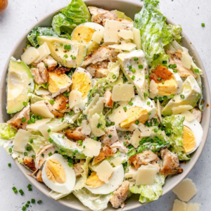 La salade César est une création classique de la cuisine américaine, avec des feuilles de laitue croquantes, du poulet grillé, des croûtons croustillants, du parmesan râpé et une vinaigrette César crémeuse.